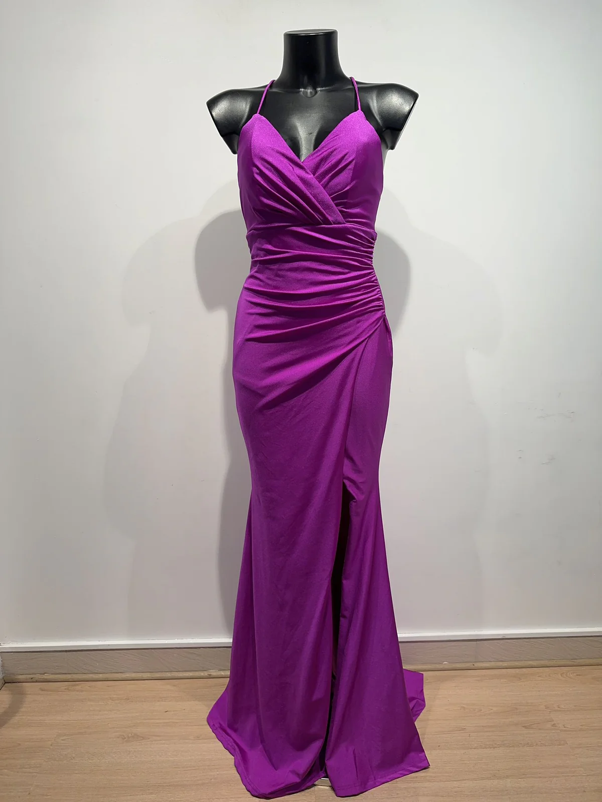 Vestido largo de corte sirena confeccionado en tejido de caída ligera con un acabado satinado.